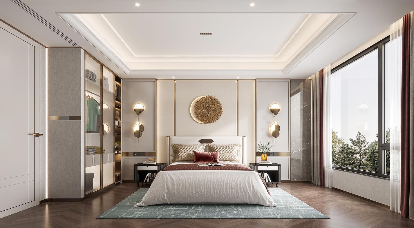 二層主臥入戶門采用了雙開門入戶形式,配備了功能完備,且尺度寬闊的全定制衣帽間及獨(dú)立衛(wèi)浴室。淺藍(lán)色極具包裹感的床,愜意而溫暖,獨(dú)特的選型成為主臥的視覺亮點(diǎn),展現(xiàn)著主人時(shí)尚大氣的品味特質(zhì)。