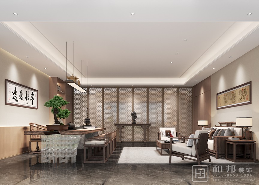 本案為新中式風格高端餐飲場所,以木色為基調,融合傳統與現代元素通過中式符號(山水掛畫、博古架 )與現代材質、燈光結合,打造出兼具文化底蘊與舒適體驗的宴請空間,適配商務、高端聚會場景。