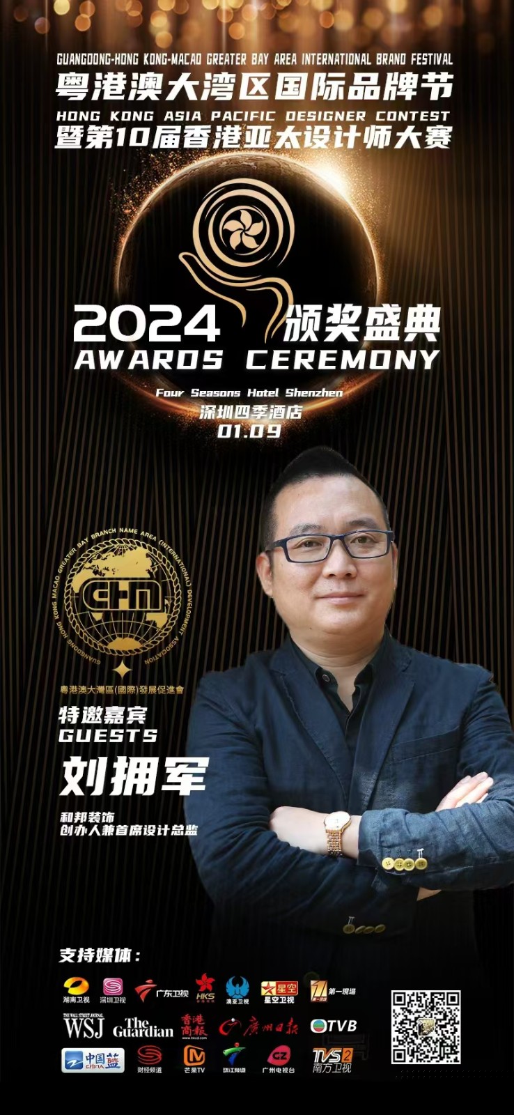 2025 年 1 月 19 日,2024 粵港澳大灣區國際品牌節暨第十屆香港亞太設計頒獎盛典在深圳福田區福華三路 138 號深圳四季酒店隆重舉辦。和邦設計創始人劉擁軍作為特邀嘉賓出席此次盛會,彰顯了其在設計領域的專業影響力。