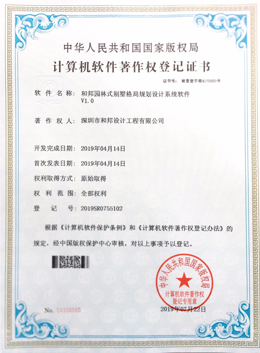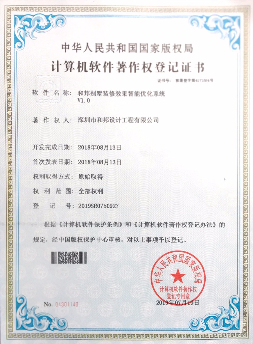 根據《中華人民共和國計算機軟件保護條例》和《計算機軟件著作權登記辦法》的規定,經中華人民共和國國家版權局審定,我公司自主研發的7款軟件被正式授予《中華人民共和國國家版權局計算機軟件著作權登記證書》,7款軟件分別為:“和邦別墅裝修效果智能優化系統V1.0”、“和邦室內辦公環境空間模擬規劃系統軟件V1.0”、“和邦別墅裝飾色彩搭配設計模擬軟件V1.0”、“和邦室內裝修效果3D模擬系統軟件V1.0”、“和邦精裝樣板房設計三維模擬系統V1.0”、“和邦別墅室內采光效果智能分析系統V1.0”、“和邦園林式別墅格局規劃設計系統軟件V1.0”。