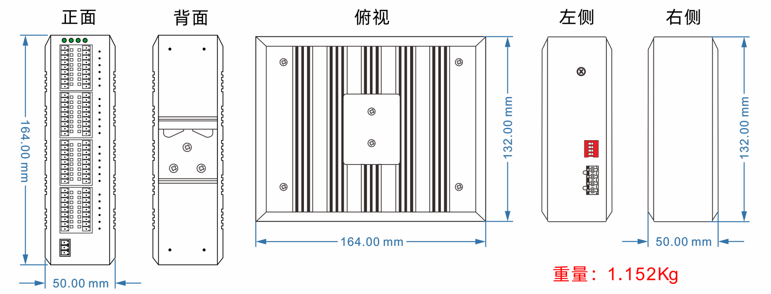 外殼:IP40防護等級,鋁合金材質 尺寸:164mm(長) x 132mm(寬) x 50mm(高) 安裝方式:導軌安裝、壁掛式安裝 |