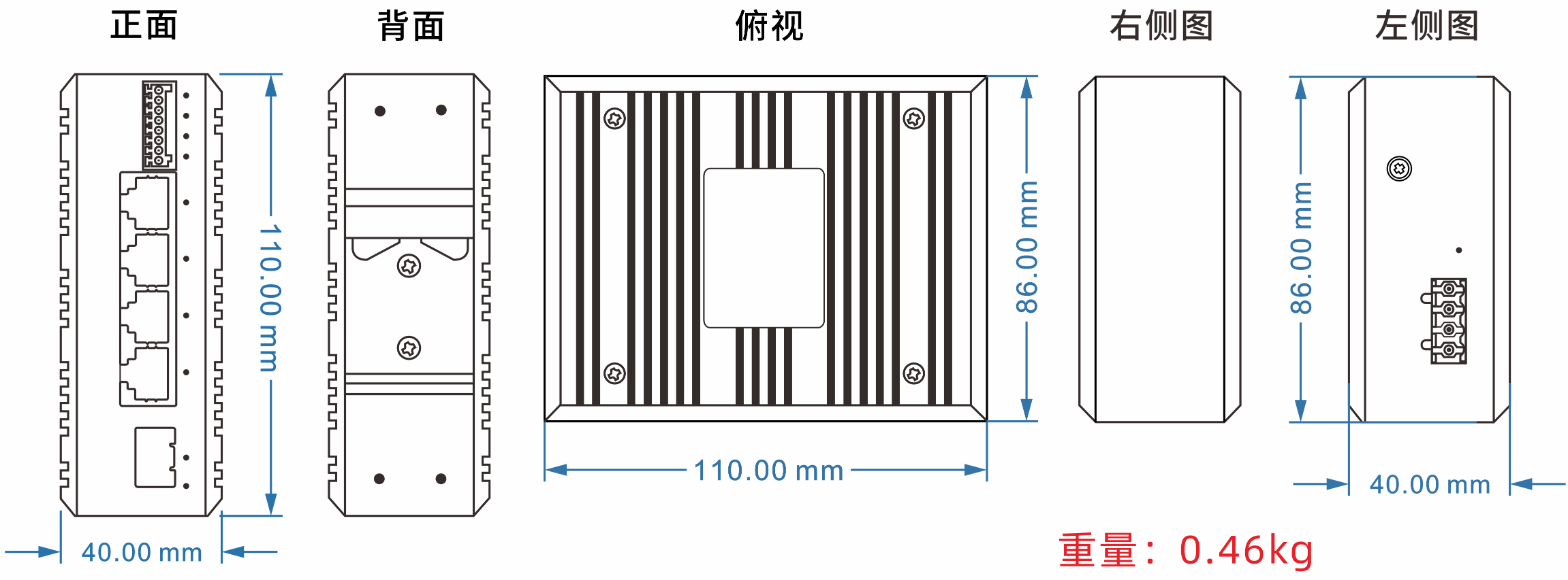 外殼:IP40防護等級,鋁合金材質 尺寸:110mm(長) x 87mm(寬) x 40mm(高) 安裝方式:導軌安裝、壁掛式安裝 |